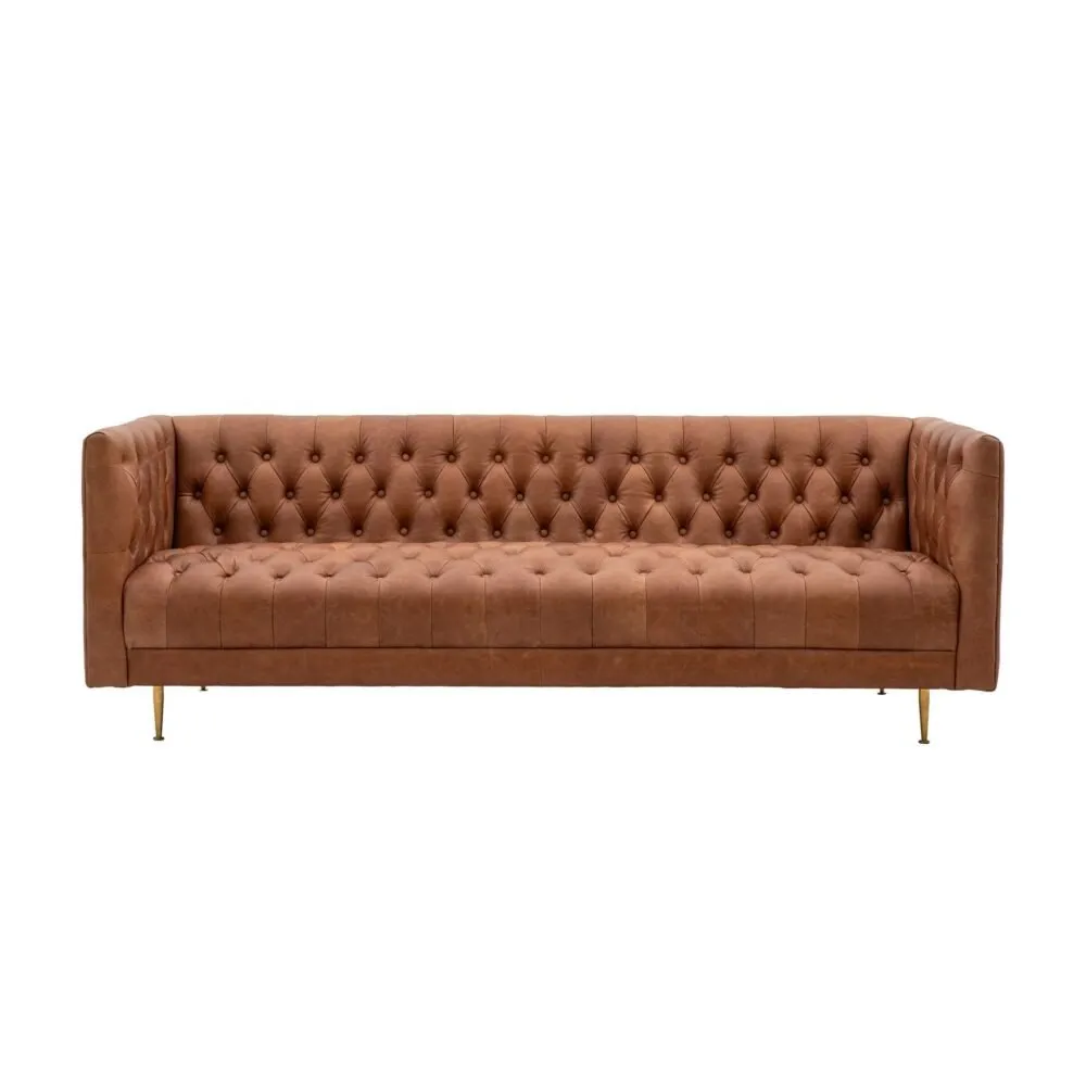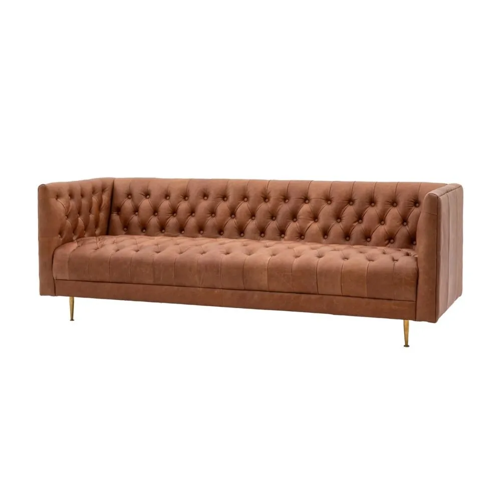 Adding a retro vibe to your living room with this beautiful 3 Seater Tufted Leather Sofa. Crafted with a soft leather in an antique brown tone, complete with decorative buttoning details to the arms, seat and backrest. Finished with elegant metal legs to compliment the sofa perfectly. Kick back and put your feet up in style with this comfortable yet stylish design.