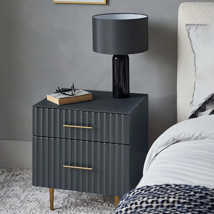 Meet the dark grey 2 drawer bedside table, a stylish and functional option for your bedroom. The fluted detailing and brass accents will bring elegance, while the 2 drawers offer plenty of storage. The tempered frosted glass top ensures durability, making it perfect for everyday use. With drawer liners, it will add a little touch of luxury to your space. Whether you are storing night-time essentials or displaying a chic lamp, the bedside table seamlessly blends functionality with timeless design.