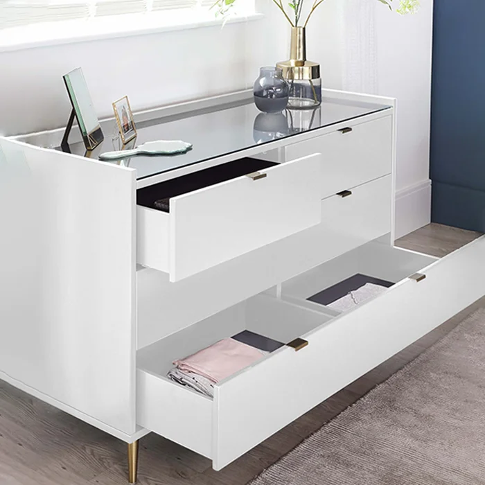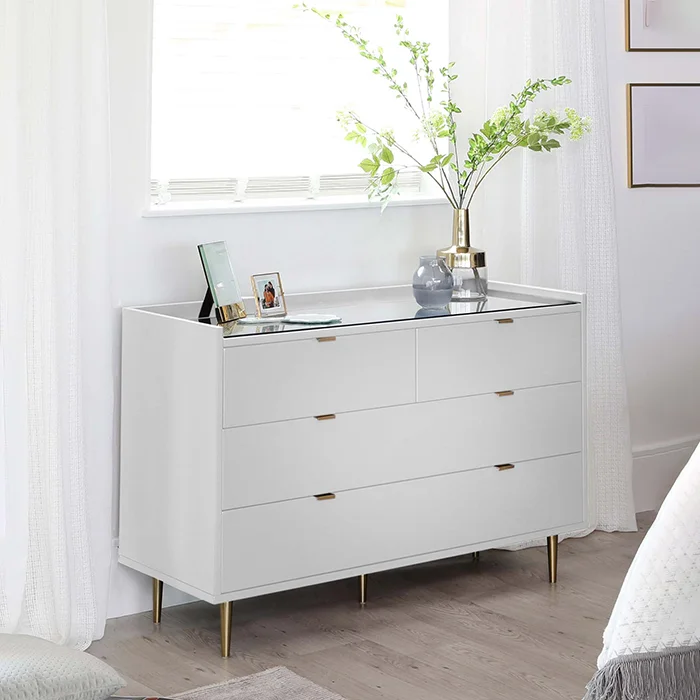 With the Orson, style is no substitute for a storage solution. With modern Dura Chest of Drawers, and contemporary brass and etched glass finishes – this sideboard storage unit is the perfect match with all beds.