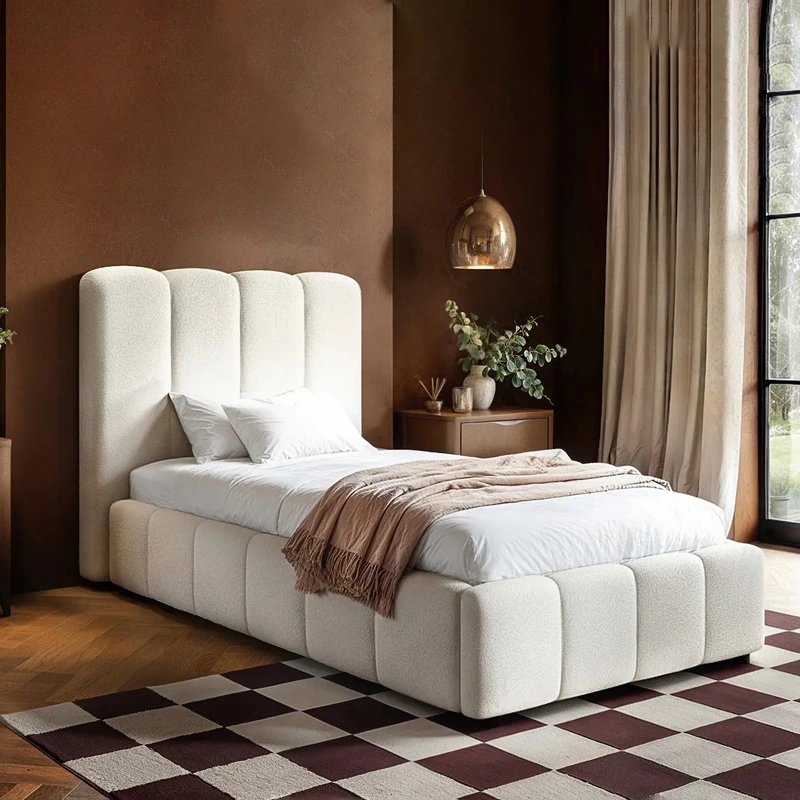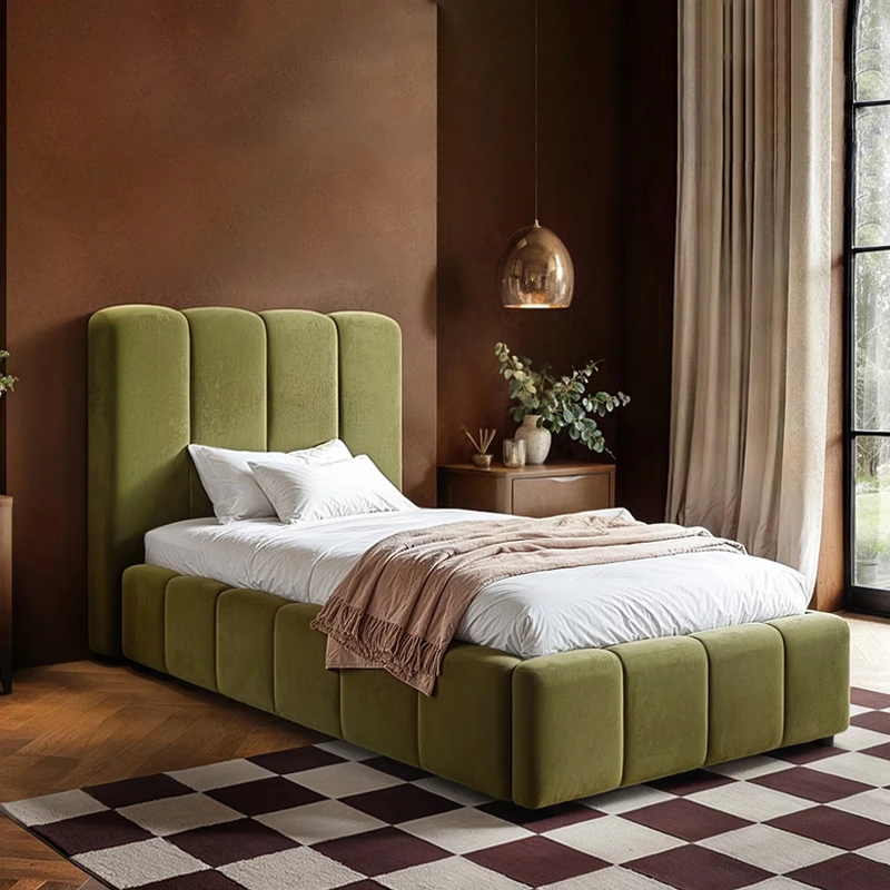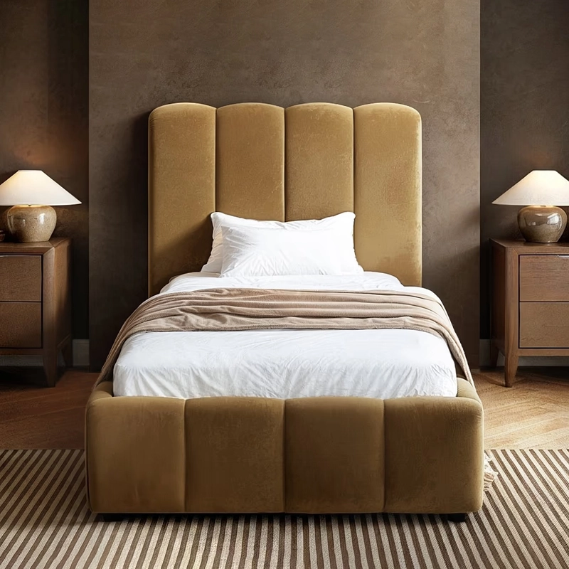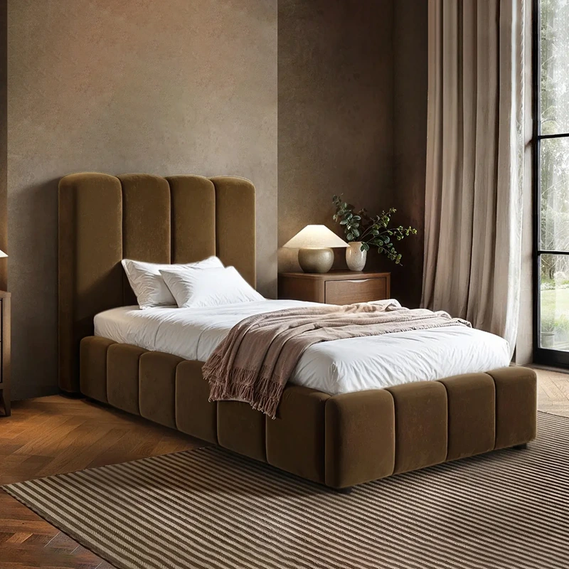 Make a statement in your bedroom with the Emilie Ribbed Single Bed. Upholstered in luxurious plush velvet, this bed features a striking tall, scalloped headboard with bold vertical panel detailing. The fully padded frame ensures comfort and safety, while the earthy, neutral tones blend with any interior.