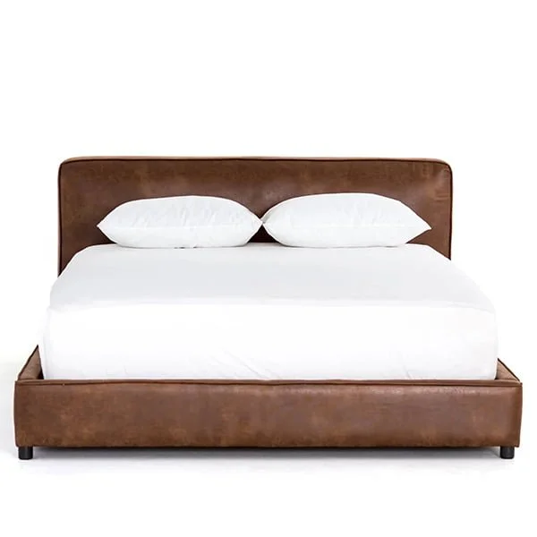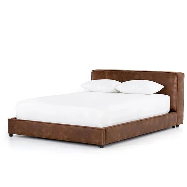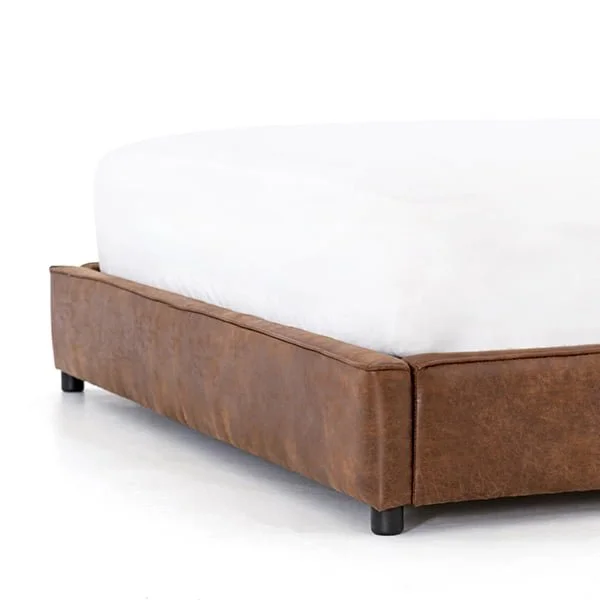 The Vintage Leather Plain Bed from Four Hands features low-profile luxury. Modern Italian design inspires this textural, leather upholstered bed that feels both substantial and plush, with clean lines for a dramatically comfortable statement.