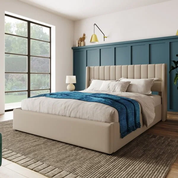 The vertical striped design of the headboard adds a creative touch to the design. The curved side bar of the headboard is both aesthetic and practical, as it prevents the mattress from sliding.