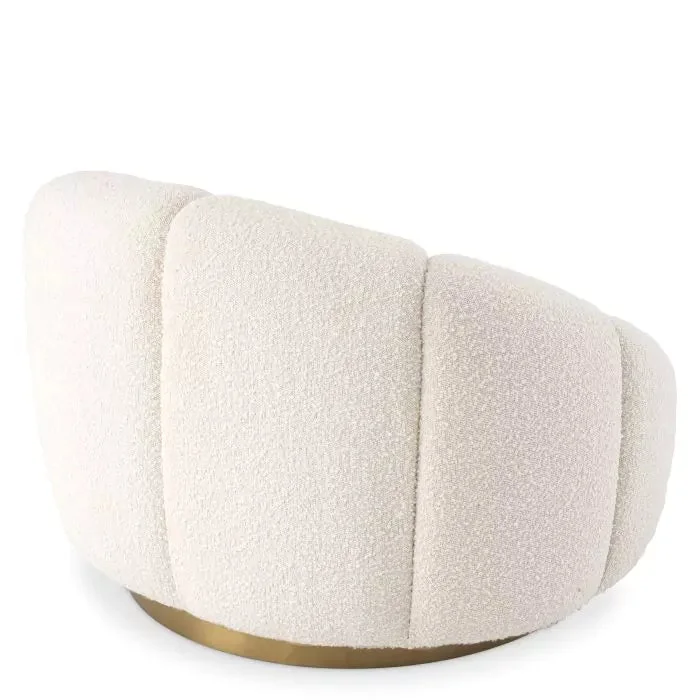 Wrapped in a sumptuously soft bouclé fabric, this armchair invites you to sink in and relax. Its unique shell-like silhouette with subtle channel tufting creates an elegant, sculpted look. Resting on a sleek gold-tone base, it allows you to effortlessly turn and engage with your surroundings, making it as functional as it is fashionable.