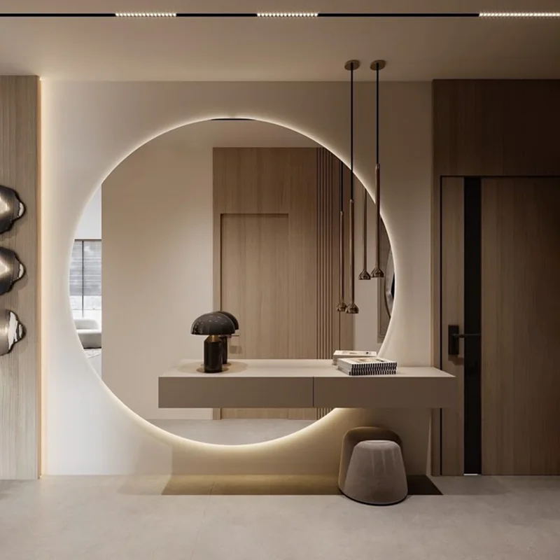 Sleek and Minimalist Console: The floating console beneath the mirror features a clean, uncluttered surface and integrated drawers (as suggested by the visible drawer line in the image) for discreet storage of your beauty essentials, jewelry, and accessories.