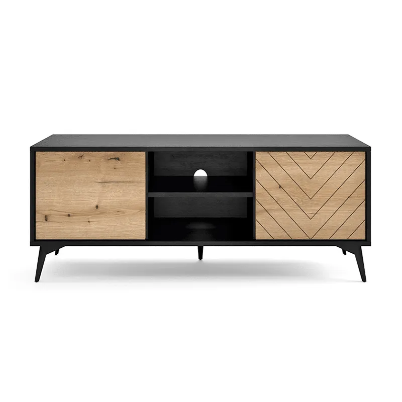Olly TV Stand in oak with a black finish. Perfectly designed stand with lots of storage space. With two PUSH-TO-OPEN compartments and a shelf between them for all your media gadgets, Olly media unit is the perfect blend of Scandi chic and cosy living. Ideal focus point for your living room.