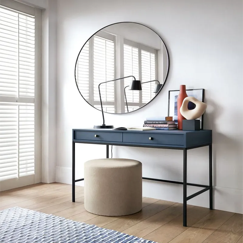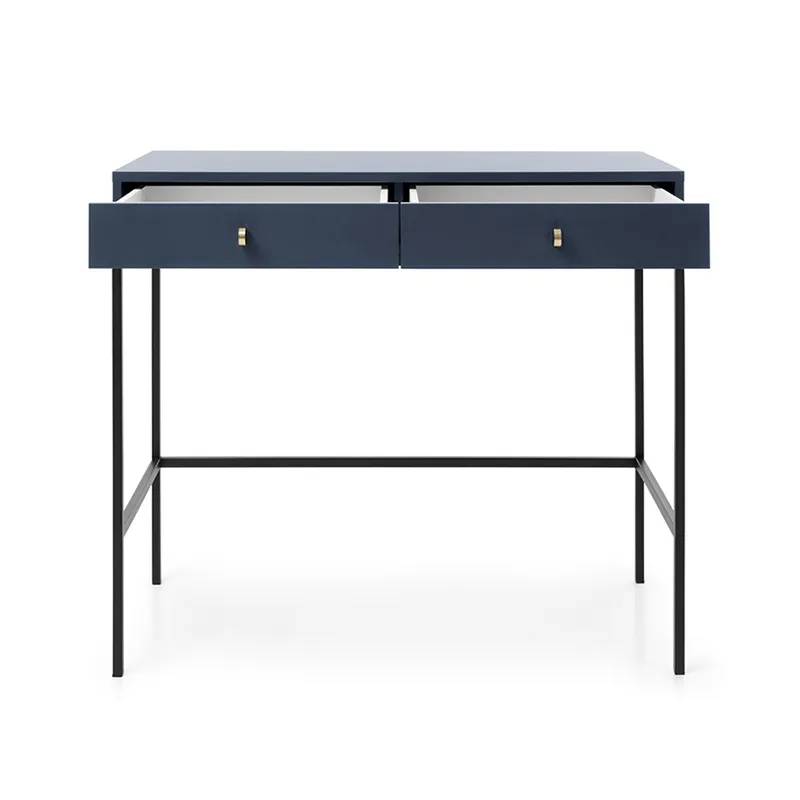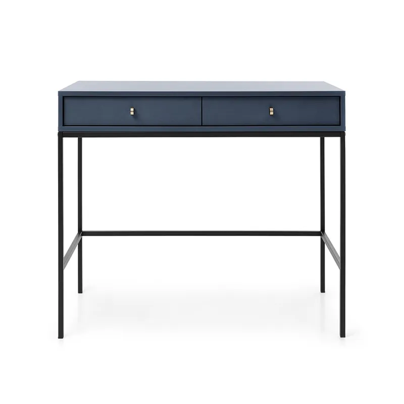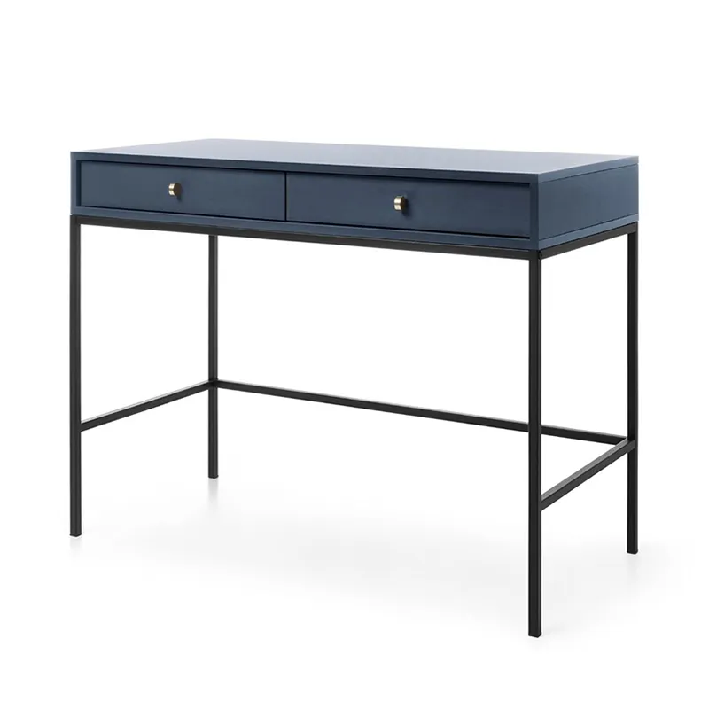 Oslo dressing table in navy blue. With a beautiful smooth edge finish and modern slim metal legs, the Oslo dressing table is the perfect blend of chic and cosy living. Two spacious drawers for all your essentials. A perfect addition to your any room with a rustic touch.