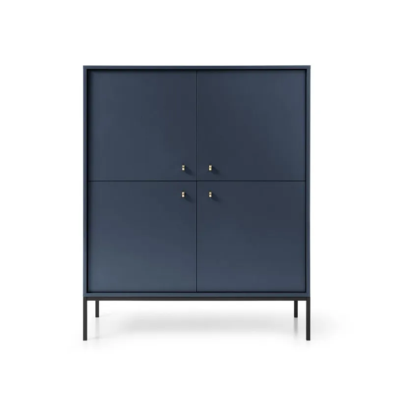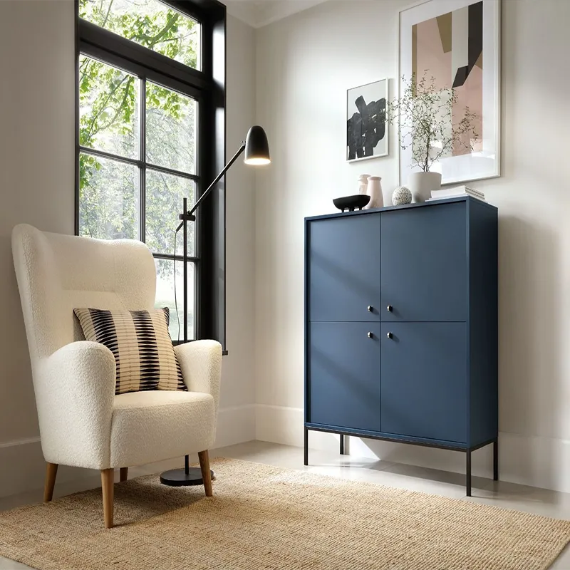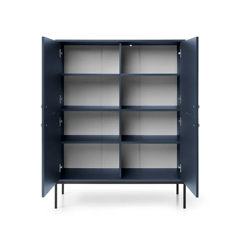 Oslo Storage Cabinet in navy blue. Perfectly designed with lots of storage space. With four sections of shelving compartments, our Oslo Storage Cabinet unit is the perfect blend of Scandi chic and cosy living. Ideal addition for any room.