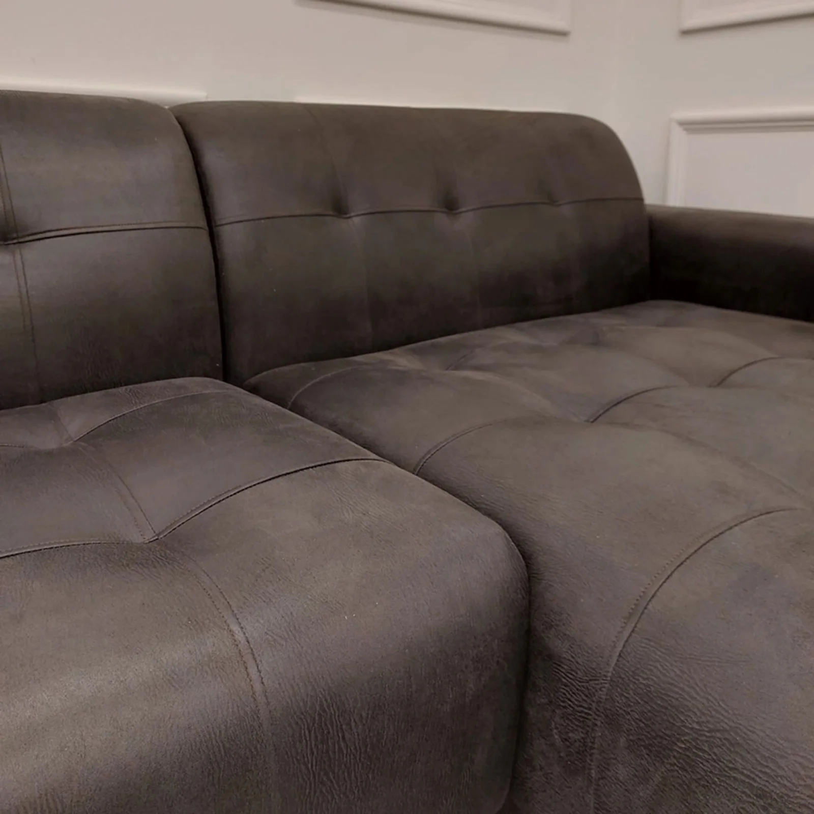 Add a sophisticated Oslo Tufted Leather Sectional Sofa to your home. The sofa comes in a Leather adding a sophisticated and masculine look. The sofa is perfect for propping your feet up and relaxing with the plush padded seats adding comfort. Complete with skinny black legs and decorative upholstered button detailing.