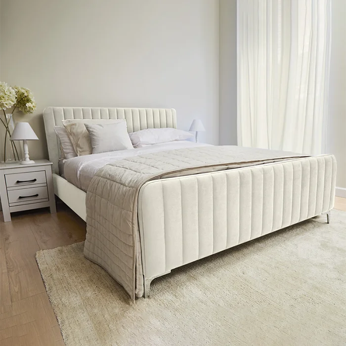 The perfect mixture of modern luxury and bang on trend, our gorgeous new Vibrant Luxury Velvet Bed is perfect for the modern style home. Its beautiful luxurious headboard is timeless sophisticated design, as well as providing you a soft place to lay your head after a long day. The bed frame features a high footboard which helps add a luxurious look and the modern chrome tapered feet add a modern design element. The perfect mixture of classic and modern style means this bed is going to look good for years to come, and versatile enough to work with any home decor.